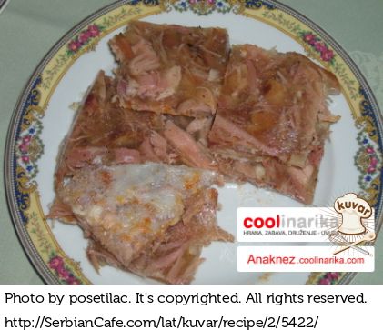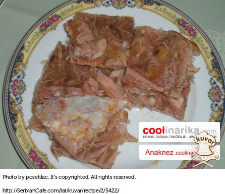 Sve ovo lagano kuvati, tek da lagano vri oko 6 h, dok se meso ne odvoji od kosti. S vremena na vreme, skidati s vrha masnoću. Kada je kuvano, procediti supu kroz cedilku, a meso staviti u veliku tepsiju u kojoj će se dobro očistiti od kostiju.