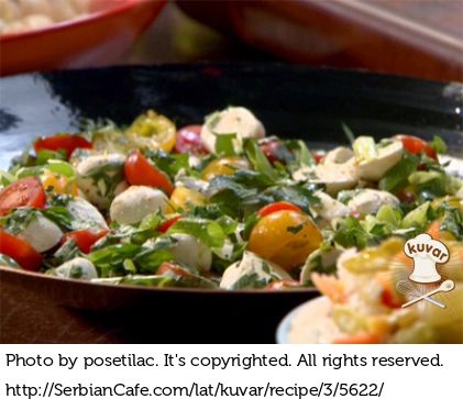 Prelijte sos preko salate, dobro promešajte i na kraju izrendajte mocarela sir.