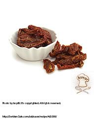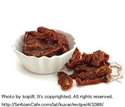 Jednu do druge polutke paradajza, naređati u tepsiju, posoliti i ostaviti da stoje 4 dana na sunčanom mestu. Naređati paradajz u sud (šira tegla) i zaliti maslinovim uljem.