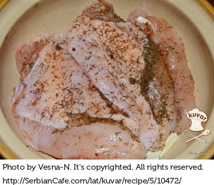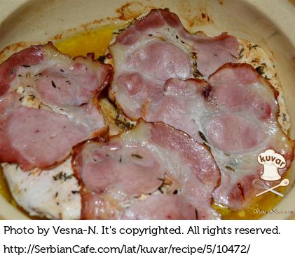 Na svako parče belog mesa staviti po 2 tanka režnja bareno-dimljene vratine i po 2 tanka listića putera.