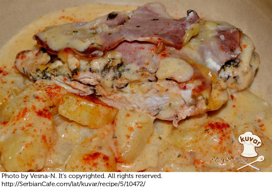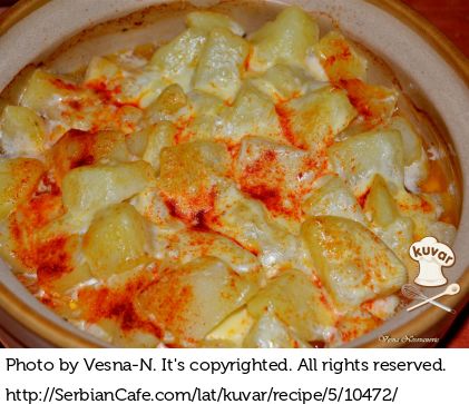 Prvi deo poslagati po vratini, na njega rasporediti kockice kuvanog krompira, te na krompir poslagati drugi deo tankih režnjeva sira.