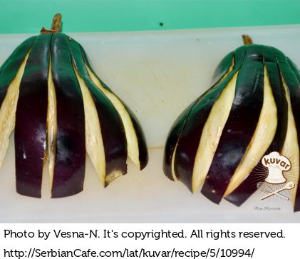 Svaku polovinu zaseći oštrim nožem na 6 do 8 delova (zavisno od debljine samog patlidžana) ali paziti da ostane nezarezan uz peteljku.