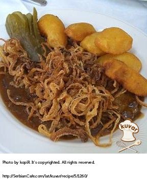 Na zagrejanom ulju propržiti crni luk, prethodno očišćen i iseckan na sasvim tanke kolutove. Luk pržiti do zlatno – braonkaste boje. Pri prženju ga uzastopno mešati (da nezagori). Rešetkastom kašikom izvaditi luk, staviti na kuhinjski papir, da papir upije ulje, i viljuškom ga malo pritisnuti, da se što više ocedi.