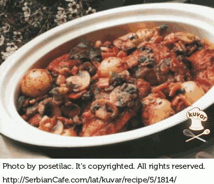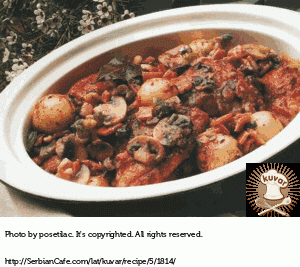 Rastopiti buter u samom loncu i propržiti na njemu komade piletine da dobiju zlatnu boju. Dodati slaninicu i luk, beli luk, pa pržiti još četiri do pet minuta. Dodati sečene šampinjone, supu, vino, seckani peršun, začiniti solju i biberom. Zatvoriti ekspres lonac i kuvati jelo desetak minuta od momenta izbijanja prve pare. U međuvremenu pomešati gustin sa odvojenom količinom supe (dve kašike), dodati u jelo i mešajući još malo uzavreti, nepoklopljeno, da se blago zgusne.