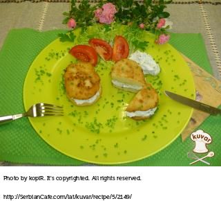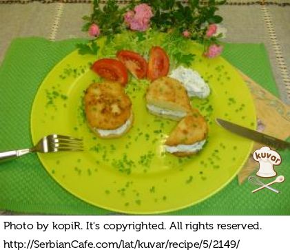 Krompir oprati i staviti da se kuva. Kada je kuvan još vruć ga oljuštiti, staviti na tepsiju i na 220°C u rerni 10 min. sušiti. Krompir ispasirati, dodati umućena žumanca, na puteru sitno iseckan i prodinstan luk, so i biber. Masu izjednačiti i 20 min. u frižider ostaviti da stoji. Od ohlađene mase kašikomm uzimati materijal, nanositi ga na vodom nakvašene ruke i oblikovati pljeskavice. Malo ih uvaljati u prezle i na vrelom ulju s obeju strana pržiti. Pržene staviti na kuhinjski papir da se ulje sacedi i naneti na tacnu. Preko svake naneti pripremljeni fil, a preko fila poklopiti drugu pljeskavicu. Ukrasiti svežim listovima peršuna i vruće servirati.