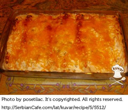 Iseći belo meso na tanke šnicle. Šnicle uvaljati u sadržaj kesice krem supe i ređati u vatrostalnu činiju. Preliti slatkom pavlakom i posuti rendanim kačkavaljem.