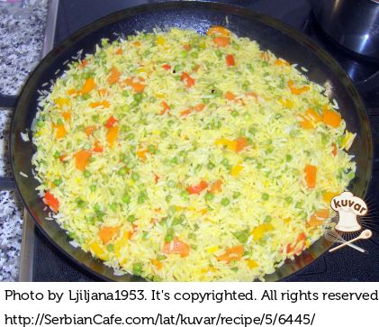 Iseći mrkvu na kockice i dinstati u ulju, dodati sitno iseckan crni i beli luk. 1 žutu i 1 crvenu papriku iseckati na kocke i dodati šargarepi, zatim dodati grašak. Zaliti skuhanom supom i sve dinstati tako da povrće bude polu tvrdo. Povrću dodati skuhanu rižu i šafran i sve dobro izmešati. Celu masu razliti u veliki pleh prečnika 40 cm. Zatim poslagati ribu i škampe i 1 crvenu papriku koju smo prethodono isekli na duguljaste štapiće.