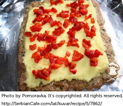 Pripremljenu smesu izručiti na foliju pa rastanjiti smesu na 1 cm debljine, kašikom naneti pire krompir preko mesa, ostaviti po ivicama malo praznog mesta, posuti seckanom crvenom paprikom pa urolati u rolat.