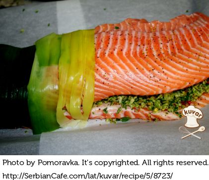 Obložite pleh papirom za pečenje, na njega stavite filet tako da ona strana sa koje je uklonjena koža bude nadole. Odozgo rasporedite fil po celoj dužini fileta i preklopiti drugim filetom. Posolite i obmotajte ribu barenim prazilukom. Premažite je istopljenim puterom i pecite oko 25 min. na 180°C.