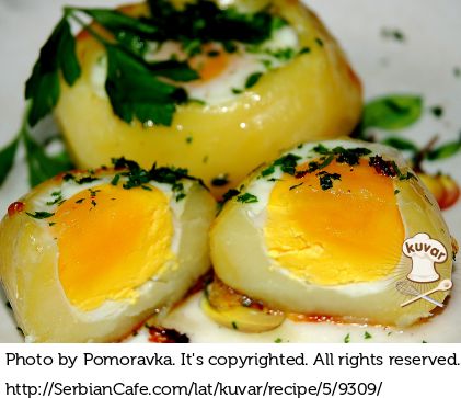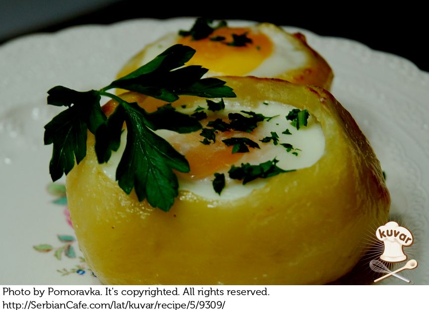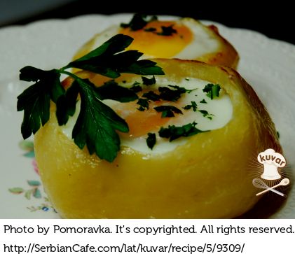 Skinuti ispečenu slaninu sa krompira i pažljivo ih izdubiti sa kašičicom, posoliti i pobiberiti i u svaki staviti po malo putera. Pazite da napravite dovoljno veliko udubljenje da može da stane jaje.