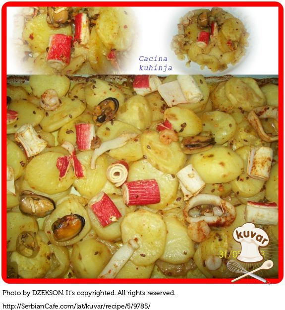 Mlad krompir i tikvice očistiti i iseći na kolutove. Napraviti mešavinu začina i posebno usoliti krompir, posebno tikvice i posebno morske plodove.