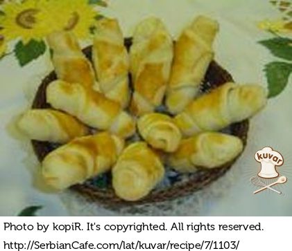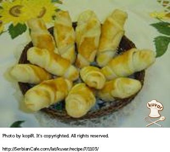 Zamesiti testo od gore navedenih sastojaka i razvući koru debljine prsta. Koru premazati 1/3 mešavine putera i brašna, presaviti je kao knjigu, zaviti u foliju i staviti 20 min. u frižider. Postupak ponoviti još dva puta. Testo podeliti na tri dela i formirati kugle. Svaku kuglu razviti u koru debljine 2-3 milimetra i prerezati na 4 dela (kao krst) koje ponovo prerezati na pola tj. dobiju se 8 trouglova (<). Na svaki trougao naneti malo marmelade i parče banane. Savijati kifle, počev od šireg ka užem kraju, ređati ih u pleh. Pleh obložiti papirom za pečenje. Premazati kifle razmućenim žumancetom kome dodati 3-4 kapi mlake vode i staviti da se peku. Peći na 200°C oko 15-20 min. u zavisnosti od šporeta.