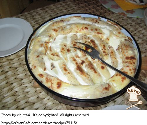 Fil: Puter, šećer u prahu i istruganu koru od limuna dobro umutiti. Jedno po jedno žumance dodati (uz mešanje), zatim topfen, kiselu pavlaku, suvo grožđe, kao i dobro umućena belanca, so i vanilin šećer. Trećinom ovog fila filovati palačinke i kao što je gore opisano iseći ih na 6 cm. dužine, složiti u pleh podmazan puterom i brašnom posutim. Staviti u rernu da se na 170°C oko 15 min. peku, izvaditi, zaliti onom trećinom fila koja je preostala, vratiti u rernu i još 20 – 25 min. peći.