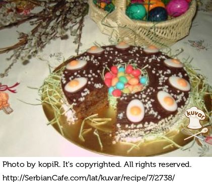 Glazura: Čokoladu pomešati sa slatkom pavlakom i na slaboj temperaturi otopiti. Otopljenu čokoladu ostaviti 2-3 minuta da se hladi (uz mešanje) i preliti kolač.