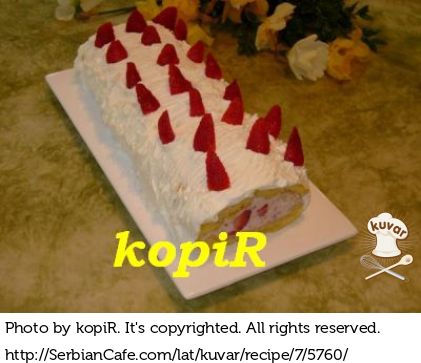 Pečenu koru prebaciti zajedno s papirom na kuhinjsku krpu nakvašenu hladnom vodom, uviti u rolat i ostaviti da se ohladi. Ohlađenu koru prebaciti na providnu foliju premazanu uljem, naneti pripremljen fil, pažljivo spojiti krajeve i uviti zajedno s folijom. Rolat ostaviti najmanje 6 h u frižider da odstoji (najbolje preko noći), premazati umućenim šlagom, seći i služiti.