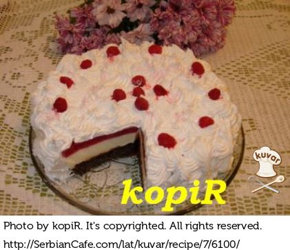 Preliv: maline pomešati sa šećerom u prahu i izmiksati. Izmiksane maline procediti, dodati želatin pripremljen po upustvu s kesice, promešati i preliti preko fila.