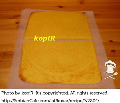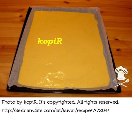 Sve dobro izjednačiti, izručiti u pleh postavljen papirom za pečenje (45 x 35 cm) pažljivo razvući po papiru i peći na 180°C (rerna s ventilatorom) oko 6-8 min.