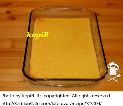 Pečenu koru ostaviti 5 min da se hladi, pažljivo skinuti papir na kome se pekla i podeliti po dužini na pola. Jedan deo preneti u sud odgovarajućih dimenzija za tu polovinu kore, preko raspodeliti vruć fil i na kraju poklopiti drugim delom.