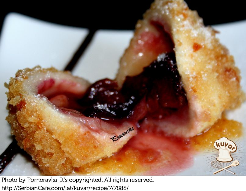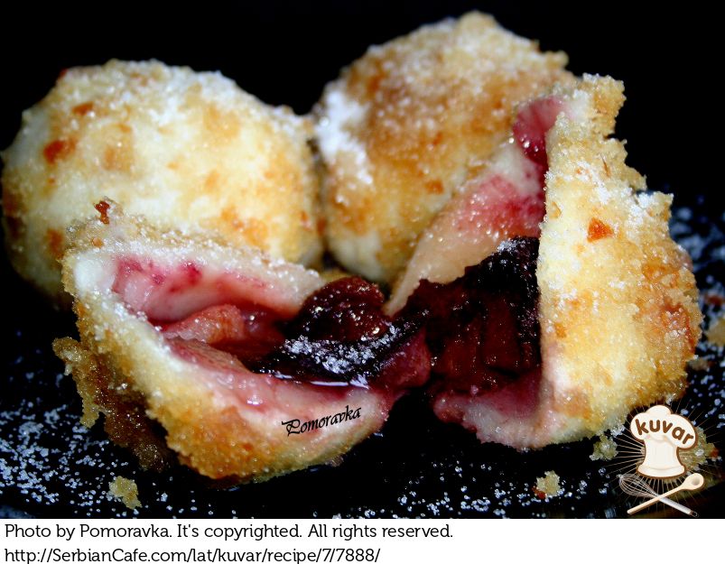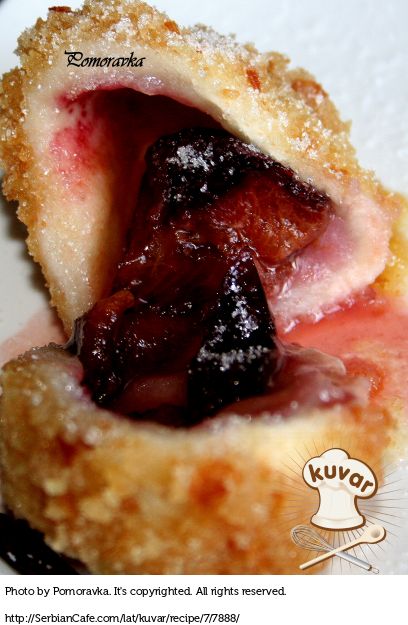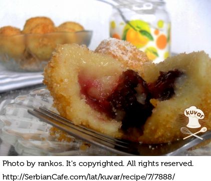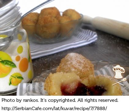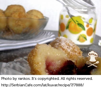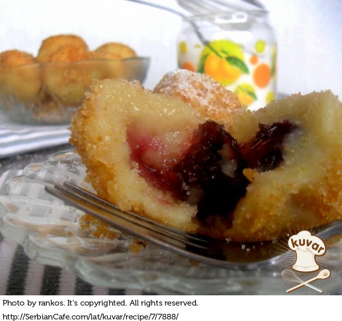 Svaku lopticu stavite na dlan i sa drugom rukom malo stisnite lopticu kao pljeskavicu, na sredinu ubacite šljivu ili višnju ili jagodu ili kašikicu pekmeza, preklopite i oblikujte lopticu, tako dok ne utrošite svo testo.