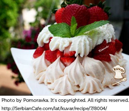 Na ohlađenu koru staviti malo šumskog voća, preko staviti maskarpone sira, preko sira malo umućene slatke pavlake i ukrasiti sa još voća i listovima nane.