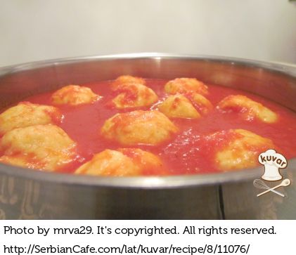 U drugu ciniju usuti obe vrsta brasna, sodu bikarbonu i so. Promesati i polako dodavati u ciniju sa jajima. Od navedene smese napraviti knedlice. Knedlice skuvati u vodi.