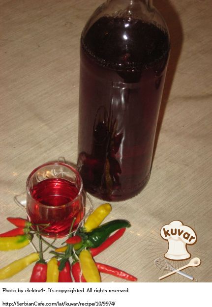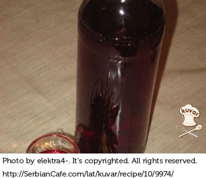 Sve skupa malo ohladiti i u to dodati alkohol (rum ili rakiju). Ostaviti preko noći i drugi dan uliti u flaše u koje ste dodali nekoliko svežih plodova (radi ukrasa)