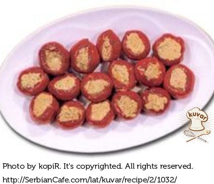 Paprike oprati, očistiti od semenki i puniti pripremljenom masom. Punjene paprike naređati u podmazanu tepsiju i peći dok paprike ne omekšaju.