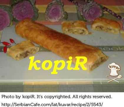 Fil: Na zagrejanom ulju malo propržiti iseckan luk, dodati izrendisanu šargarepu, dinstane pečurke (dinstati s bujonom dok tečnost ne ispari) kuvani pasulj i začine. Uz mešanje (na smanjenoj temperaturi) pržiti 2-3 min. dodati peršun i ostaviti da se ohladi. Ohlađenoj masi dodati senf, promešati i naneti na koru. Preko fila posuti orahe, a zatim saviti koru.