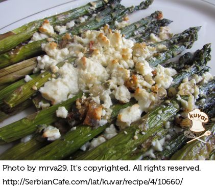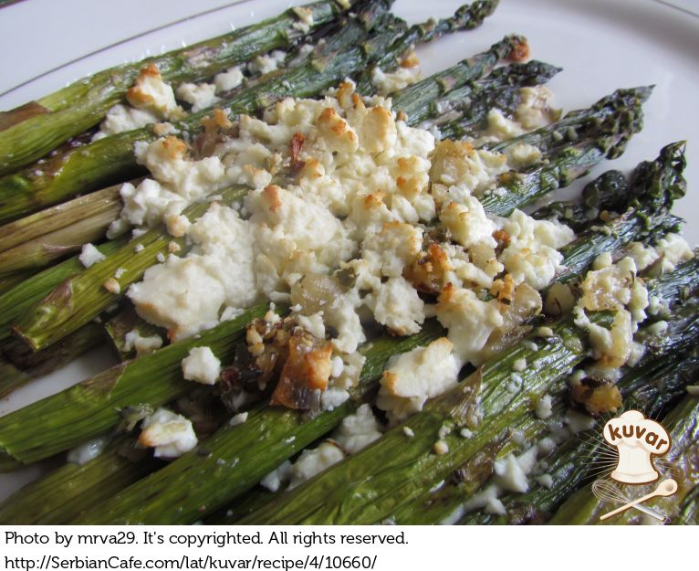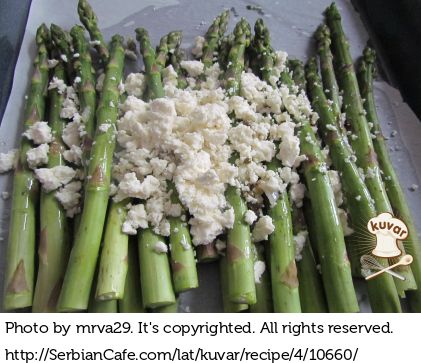 Zatim posuti ulje preko špargli. Posuti i malo soli, bibera i feta sira.