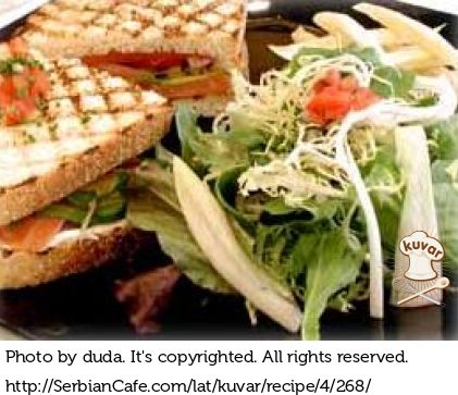 Ispržiti hleb i namazati maslacem. Jaja umutiti sa brašnom i mlekom. Ribu narezati na komadiće i kratko propržiti na maslacu. U to umešati jaja, ispržiti, posoliti, umešati vlasac i staviti na hleb.