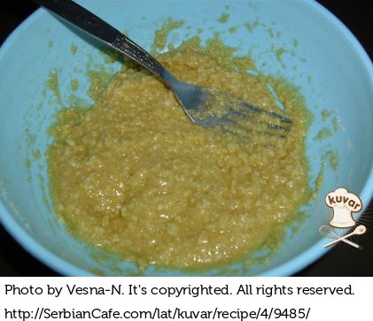 Jaje viljuškom umutiti, dodati listiće maslaca, griz, so i muškatni oraščić i dobro viljuškom umutiti.