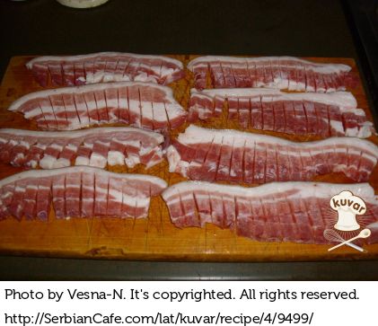 Zamolite mesara da Vam naseče svežu mesnatu slaninu na režnjeve debljine 5 mm., ili ako nabavite svežu slaninu u komadu kao što sam ja onda je malo zaledite i sećite na režnjeve.
