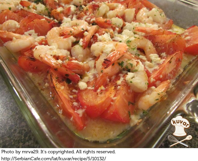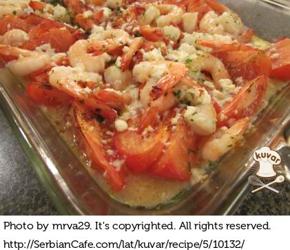 Posle 20 min. dodati skampe, peršun, limunov sok i feta sir. Sve polako izmešati i nastaviti sa pečenjem 15 min.