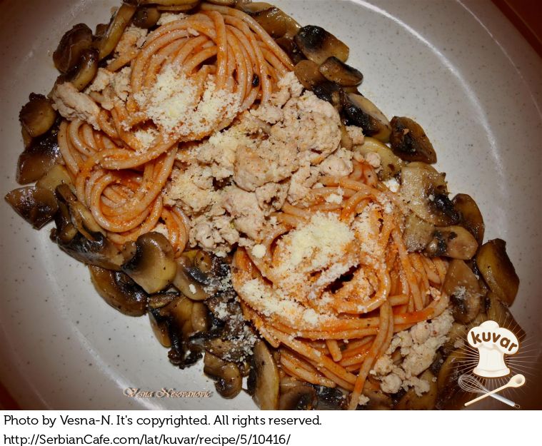 Špagete preliti sa toplim umakom, dodati prženo meso i šampinjone i lagano viljuškom izmešati.