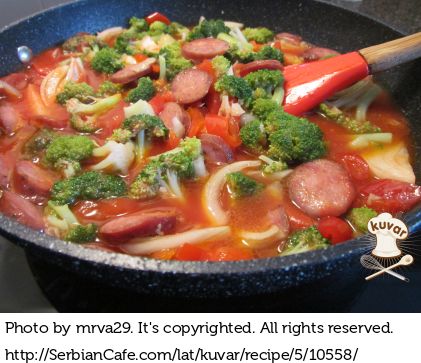 Iseckano povrce dodati u tavu sa kobasicama. Promesati posle par minuta.