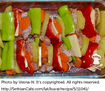 - krompir, medaljon od belog mesa, šargarepu, sir, zelenu papriku te krompir na kraju