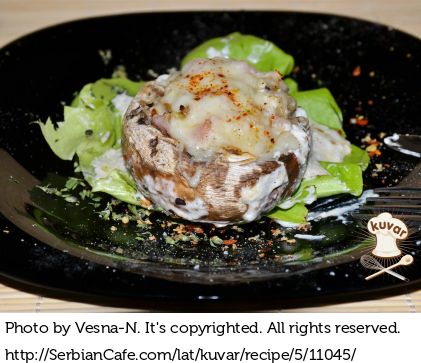 U jednoj posudi pomešati ispržene stručkove šampinjona, kockice pica šunke, kockice sira, dodati mešavinu začina i kiselu pavlaku i dobro viljuškom izmešati da se svi sastojci sjedine.