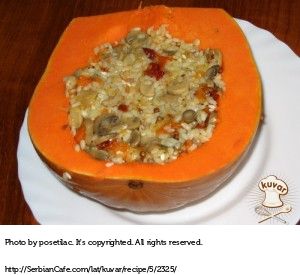 Na maslinovom ulju prodinstajte crni i beli luk, pa dodajte nekoliko kašika sastrugane tikve, još malo dinstajte. Dodajte sve začine, sušeni paradajz i pečurke. Na kraju umešajte pirinač. Ovim nadevom bogato nafilujte tikvu, prelijte kašikom maslinovog ulja, umotajte u foliju, pa pecite oko sat i po. na 220°C.