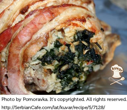 Ja zbog ukusa dodajem nekoliko šnita suve slanine/špeka, vi ako ne želite taj ukus, ne morate je ni stavljati, obmotati preko mesa.