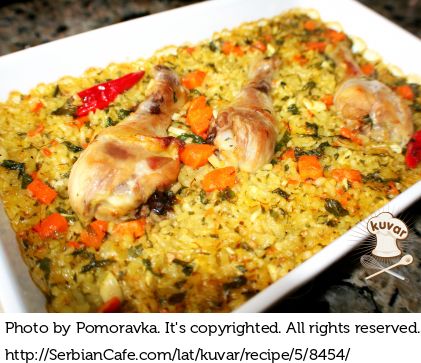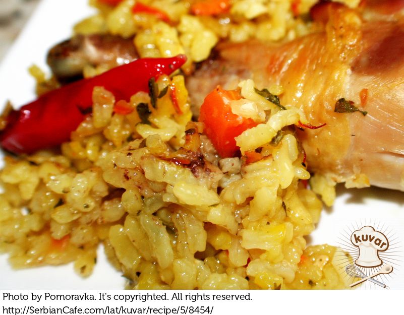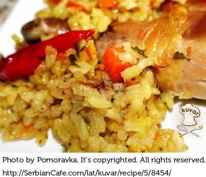 Proprženom pirinču dodati začine, po ukusu, seckani peršun, šafran, zajedno sa vodom, sve dobro sjediniti i sipati u vatrostalnu posudu, u kojoj ćete peći.