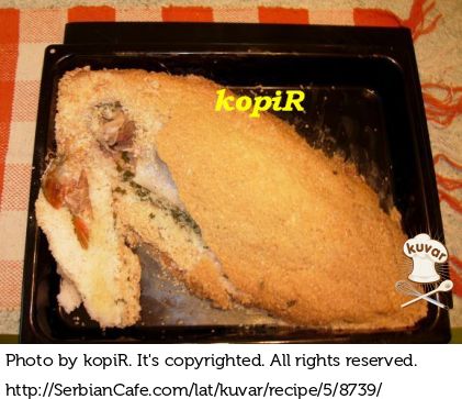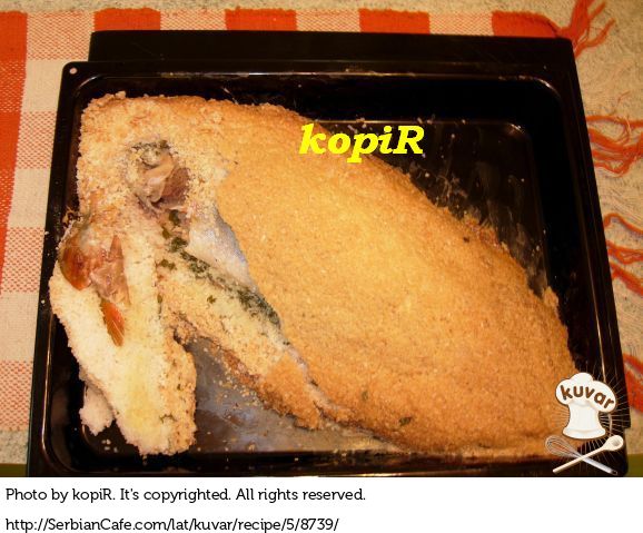 Polovinu mase izručiti u pleh (postaviti u pleh alum. foliju) naneti preko ribu I istu napuniti peršunom.