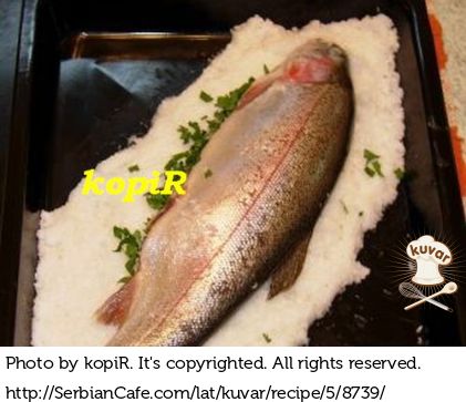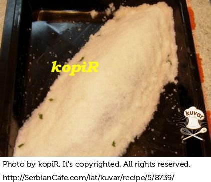 Preko ribe naneti ostatak mešavine soli i belanaca, dobro utapkati i peći 40-45 min. na 180°C (rerna s ventilatorom). p