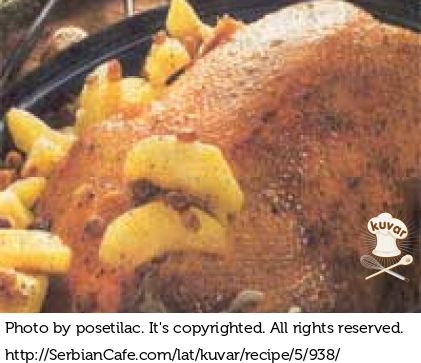 Jabuke narezati na četvrtinu, smešati sa suvim grožđem i šećerom.