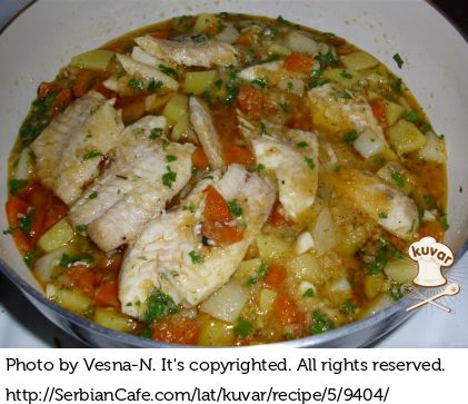 U tiganj stavimo 6 kašika maslinovog ulja iseckane začine za ribu, 1 kašiku prezla, 2 kašike kuvane šargarepu iz supe, 2 kuvana krompira i komadiće kuvane ribe.