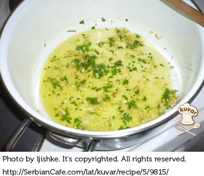 U većoj posudi jako kratko na maslinovu ulju propržiti sitno sjeckani bijeli luk, malo prezle i persuna.