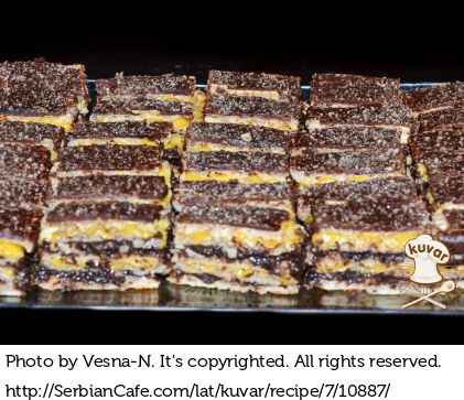 Na tamnu kremu staviti drugi list oblatne sa grubljom stranom prema gore i premazati je sa polovinom žute kreme, koju treba nožem rasporediti da sve rupice budu popunjene.