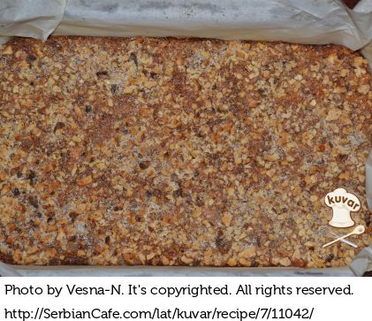 Po površini rasporedite krupno seckane orahe i vanilin šećer burbon.