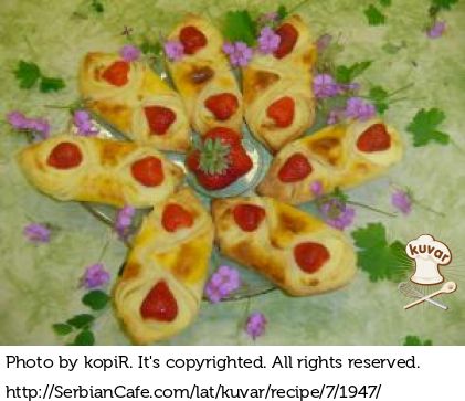 Testo razviti 3 –4 mm debljine, iseći kvadrate ca. 12x12 cm i na svaki, po sredini naneti kašiku pripremljene kreme. Dijagonalne krajeve kvadrata, premazati belancem i spojiti krajeve (dijagonalne). Premazati umućenim žumancetom i 3-4 kapi mlake vode i staviti u tepsiju, postavljenu papirom za pečenje da se peče. Peći na 200°C 10 min smanjiti temperaturu na 180°C i nastaviti s pečenjem još 5-7 min u zavisnosti od šporeta. Pečene ostaviti da se prohlade. Na hladne zalogaje tj. njihove krajeve (pri pečenju krema se razlije) staviti oprano pripremljeno voće.