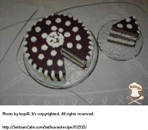 P. S. Buter i čokoladu, kada se rastope, pomeriti sa ringle i 2-3 min. mešati. Posle toga naneti na tortu. Za ukrašavanje sa šlagom, oduzeti manji deo pripremljenog fila.