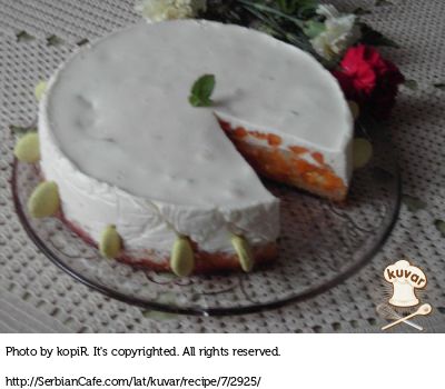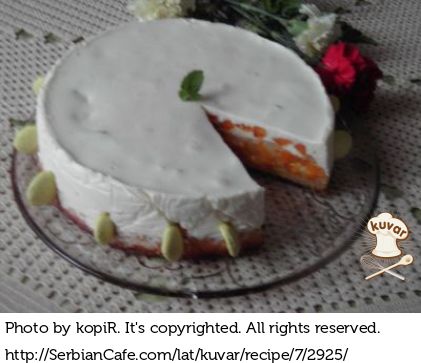P. S. Kada se kolač postavi na tacnu, naneti obruč za torte obložen providnom folijom (malo premazati uljem) a zatim naneti pripremljen krem. Posle navedenoh vermena stajanja u frižider, skinuti obruč, seći kolač i služiti.